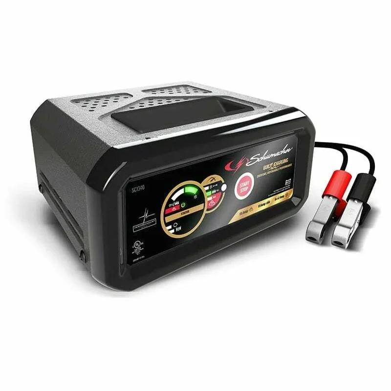 El Schumacher SC1340 es un cargador de baterías automático y multifuncional diseñado para ofrecer arranque de motor, carga, mantenimiento y desulfatación de baterías de 6 V y 12 V con total seguridad y sin intervención manual. Su control microprocesado ajusta automáticamente la corriente según el estado de la batería, brindando un rendimiento eficiente y prolongando la vida útil de la batería.